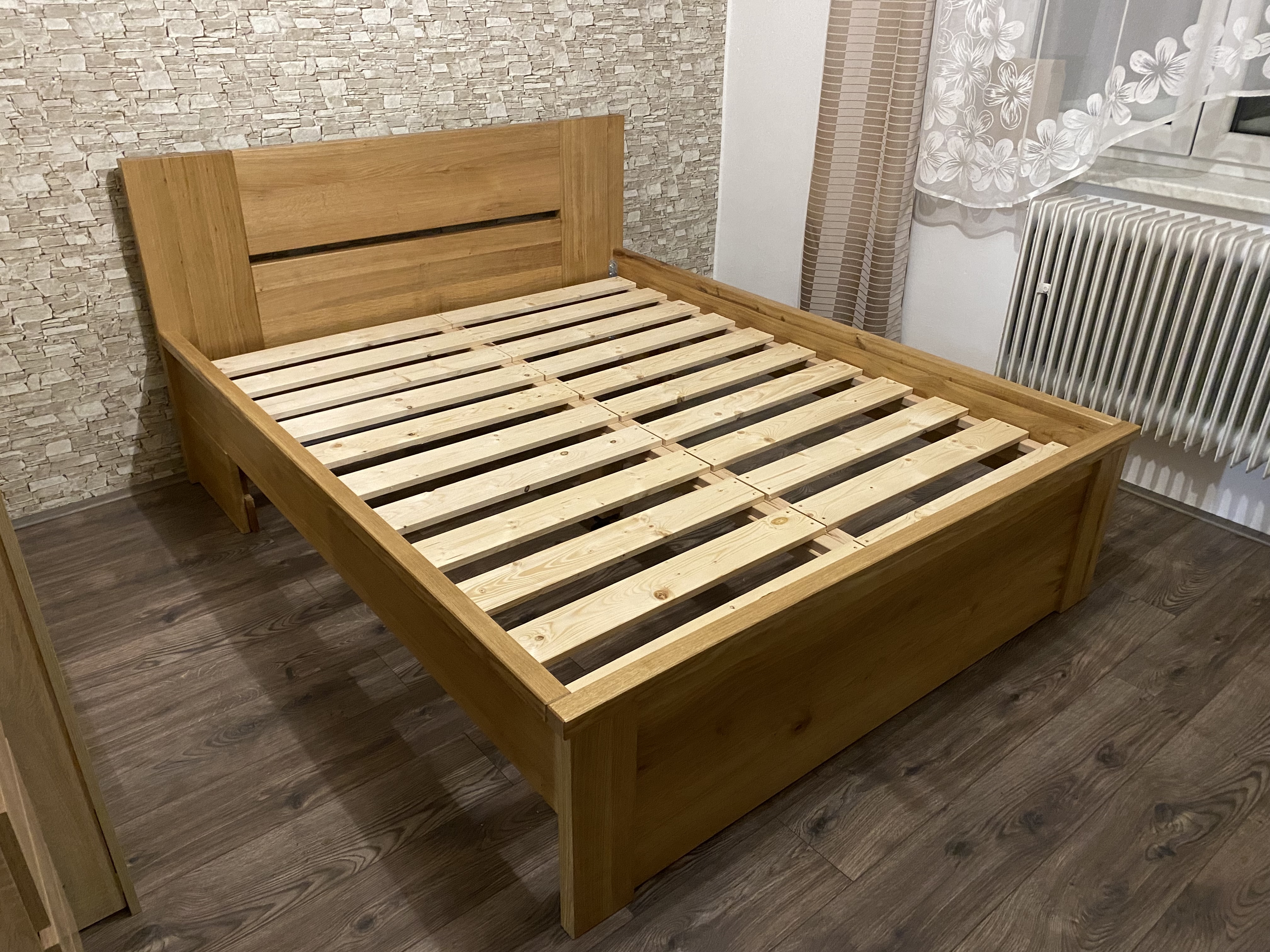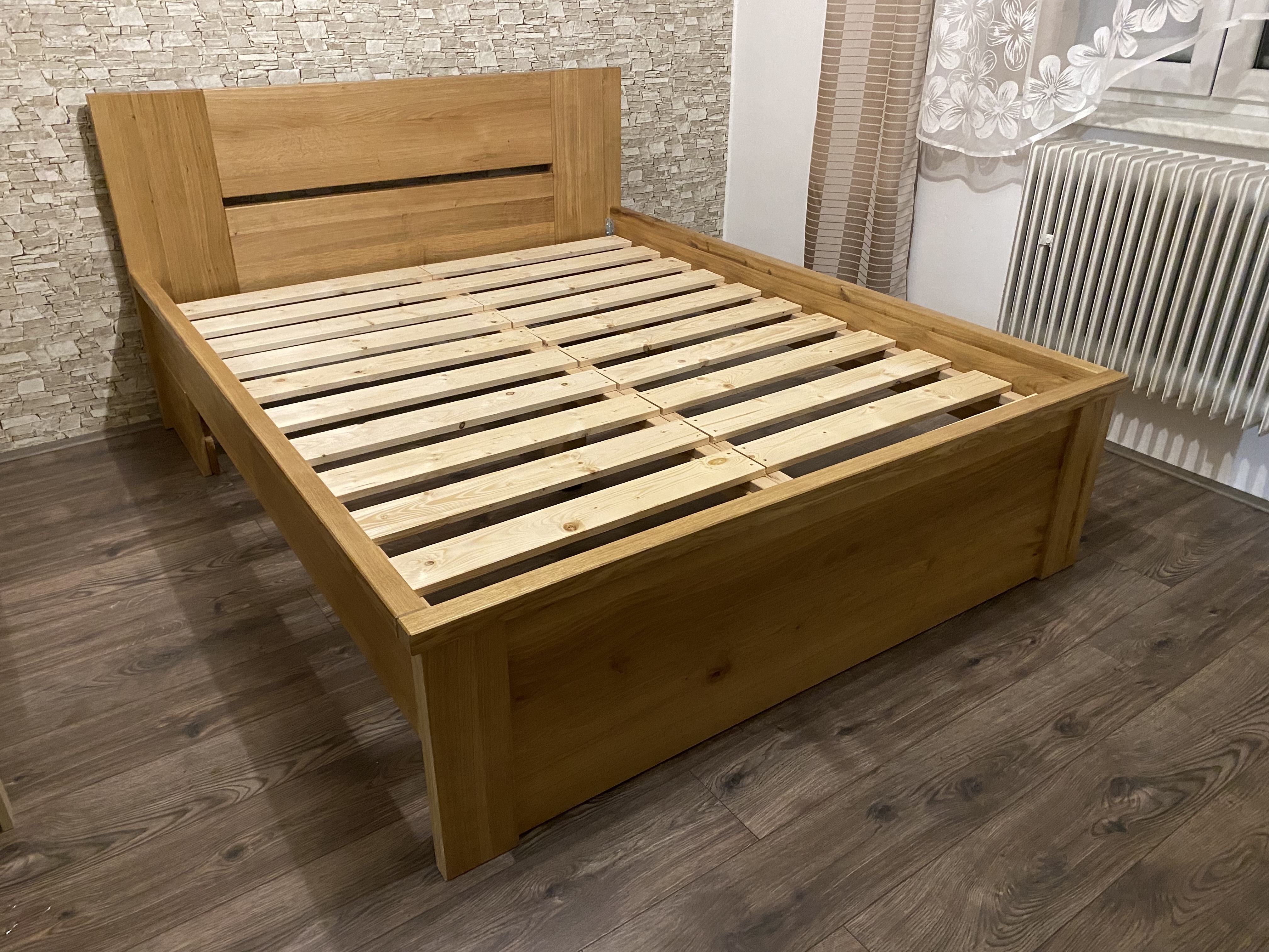 Postel z dubu masivu. Díky členěnému designovému čelu je jednou z našich nejprodávanějších postelí.