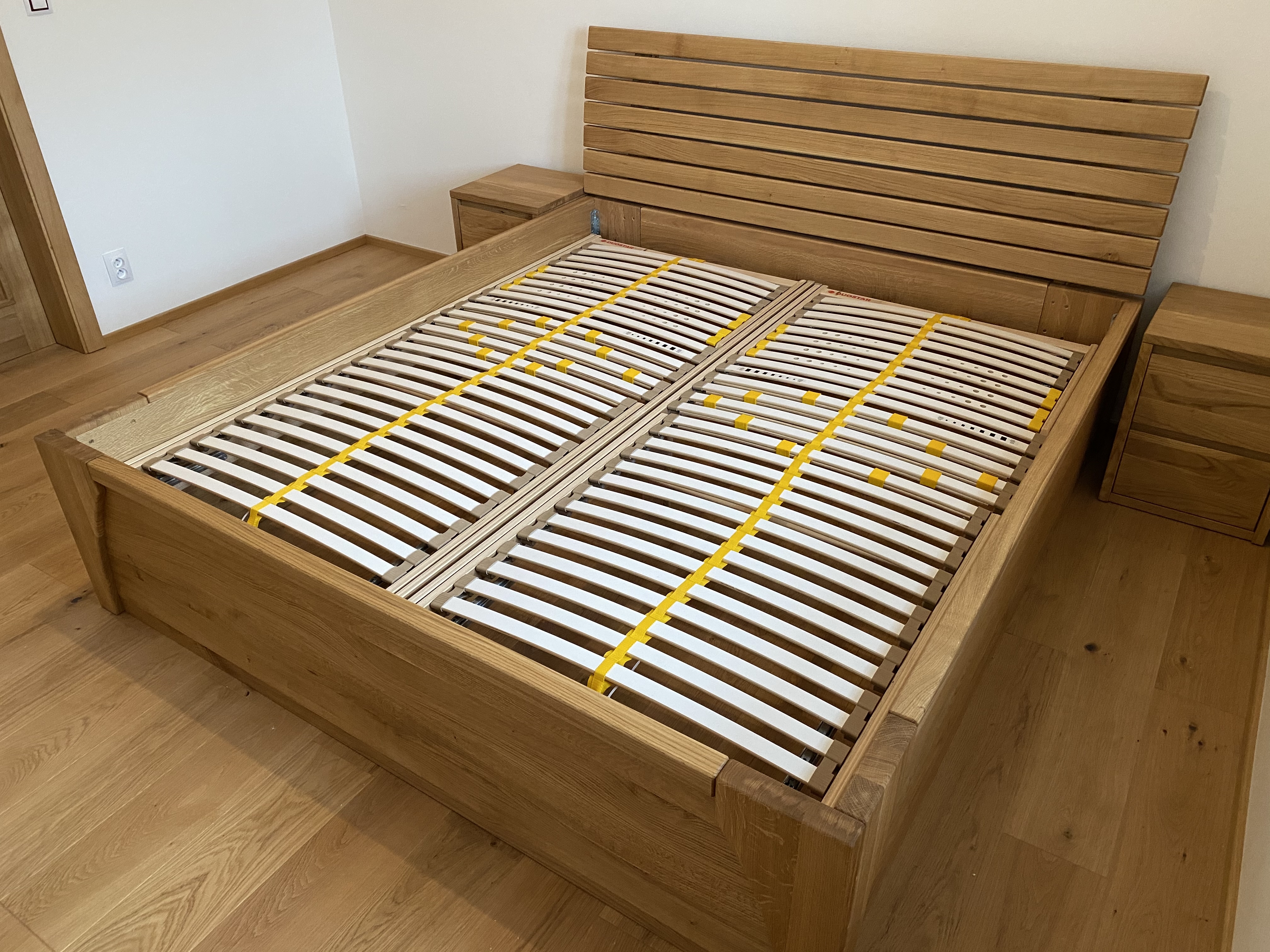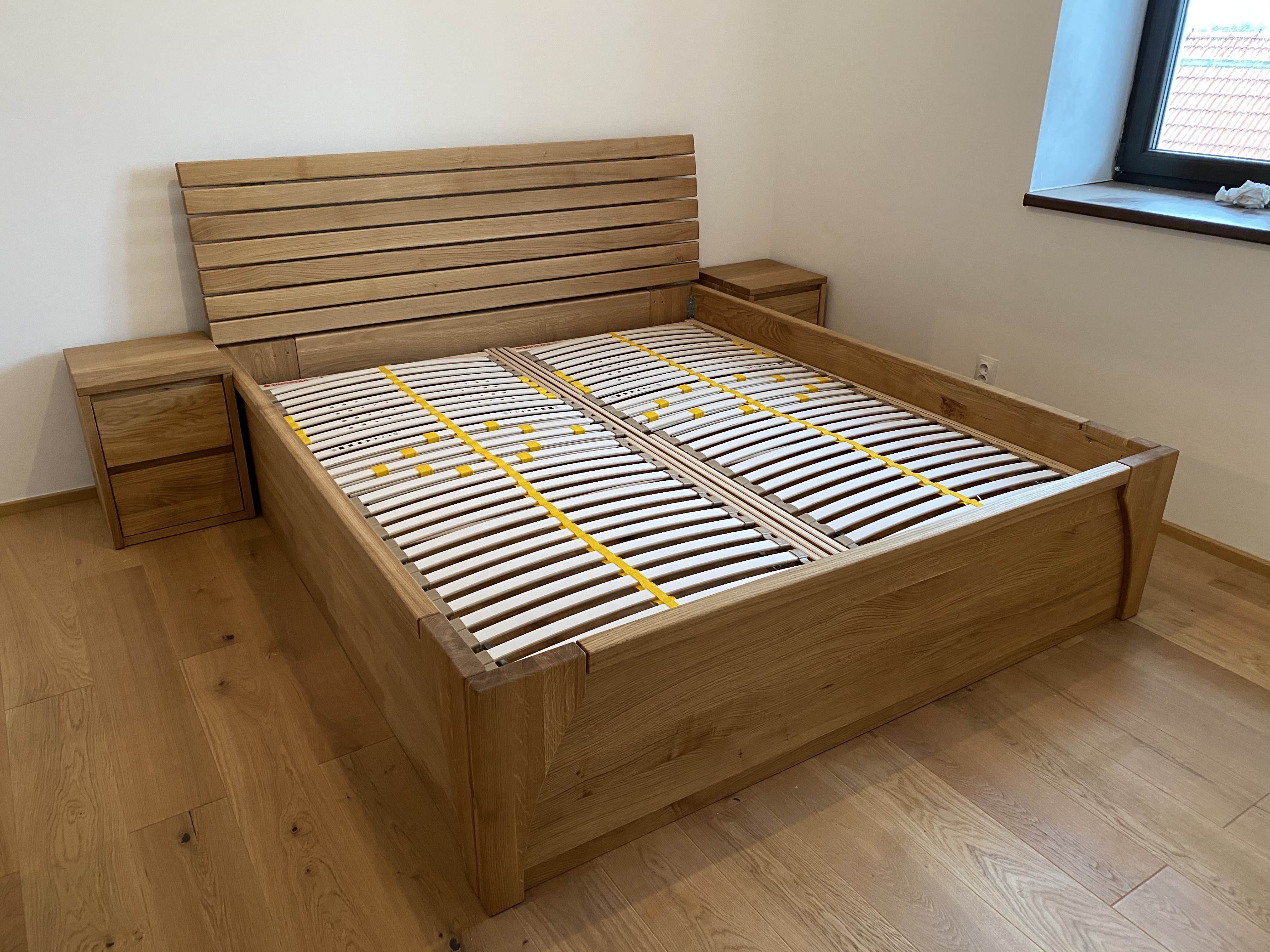 Postel z dubu masivu. Díky členěnému designovému čelu je jednou z našich nejprodávanějších postelí.