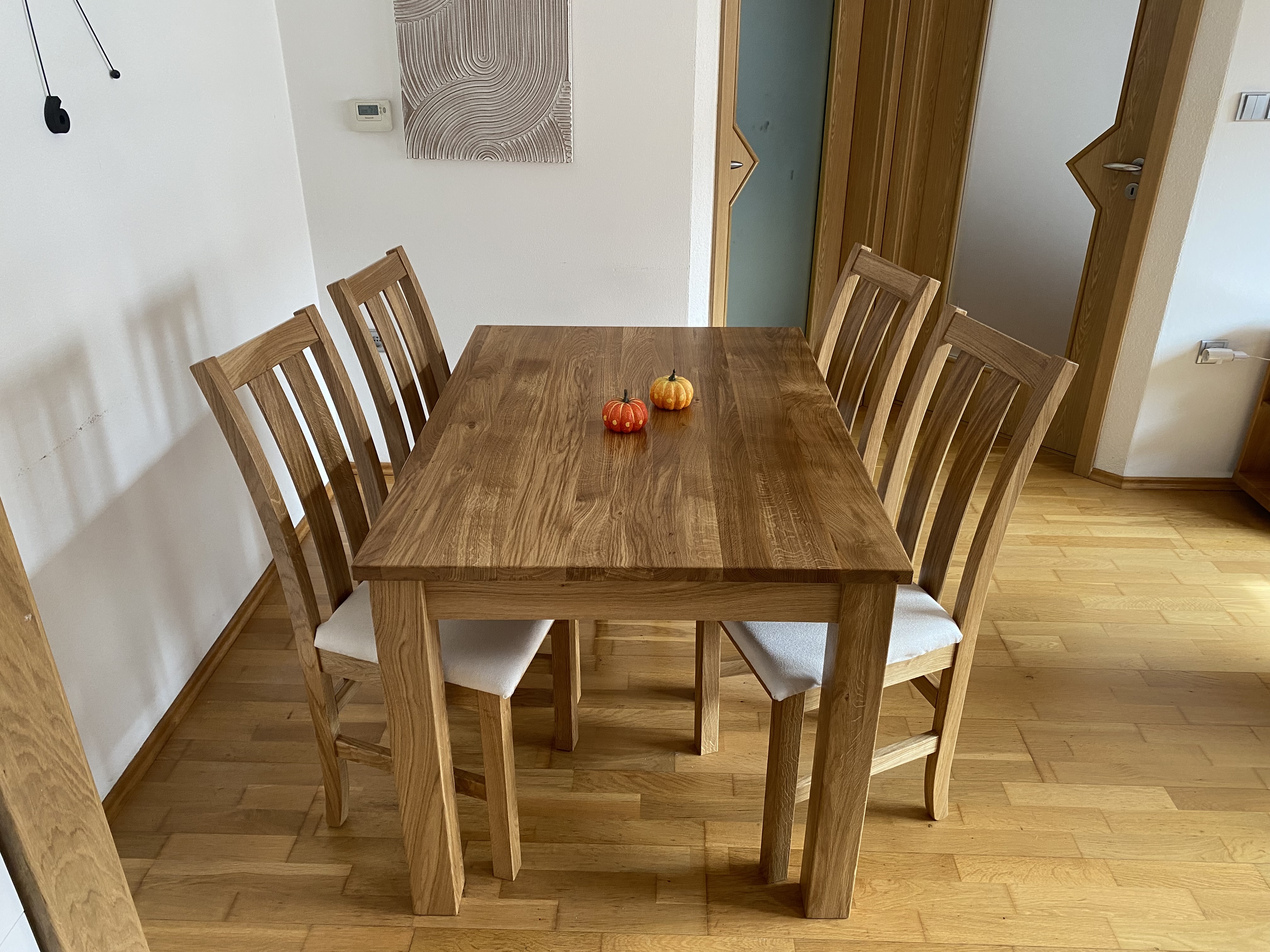 Masivní židle Žaneta ve variantě dub, buk, či ořech. Židli lze také objednávat bez čalouněného sedáku.