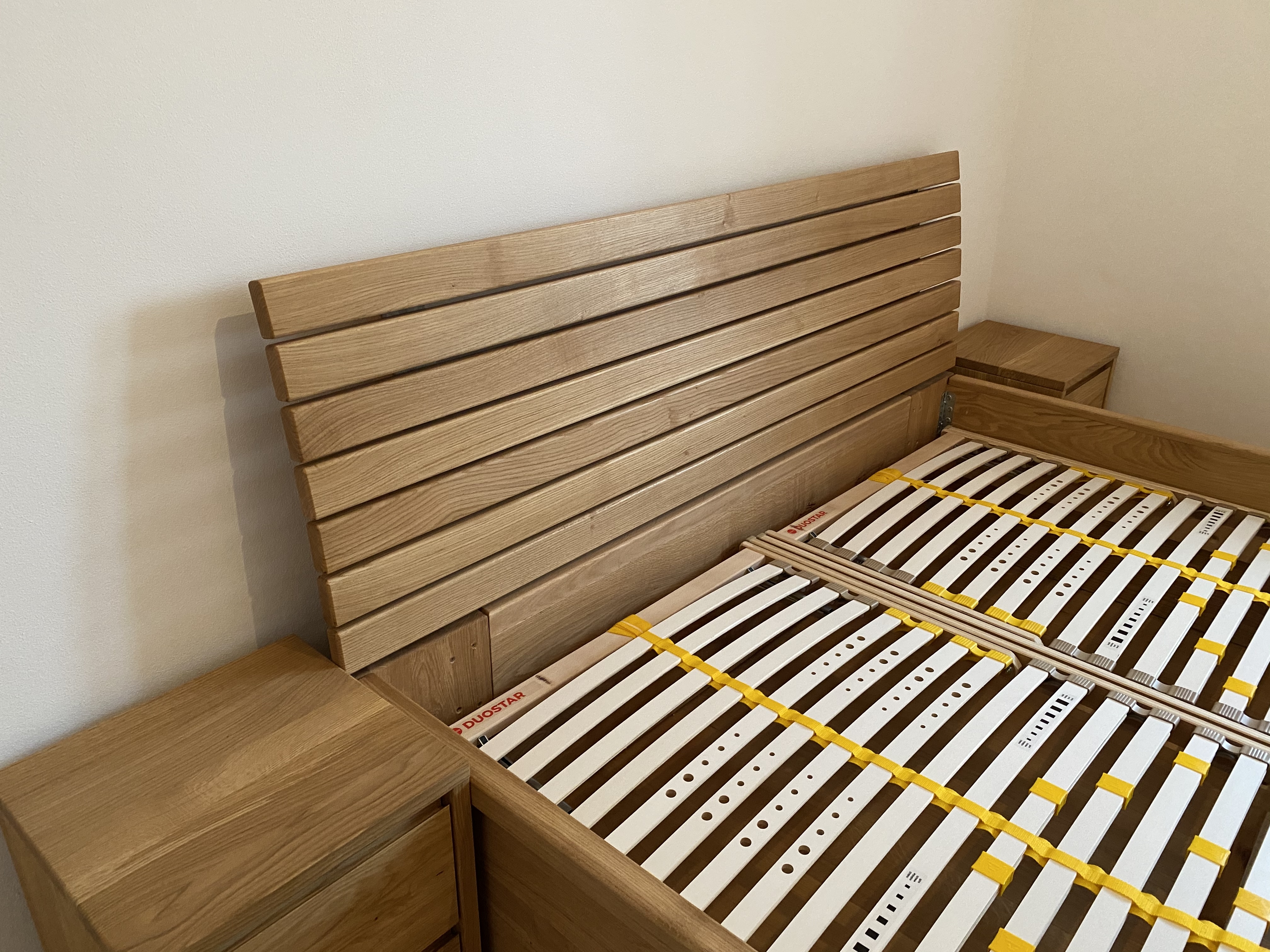 Postel z dubu masivu. Díky členěnému designovému čelu je jednou z našich nejprodávanějších postelí.