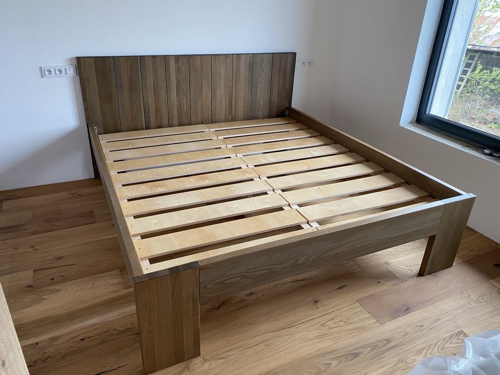 Postel z dubu masivu. Díky členěnému designovému čelu je jednou z našich nejprodávanějších postelí.